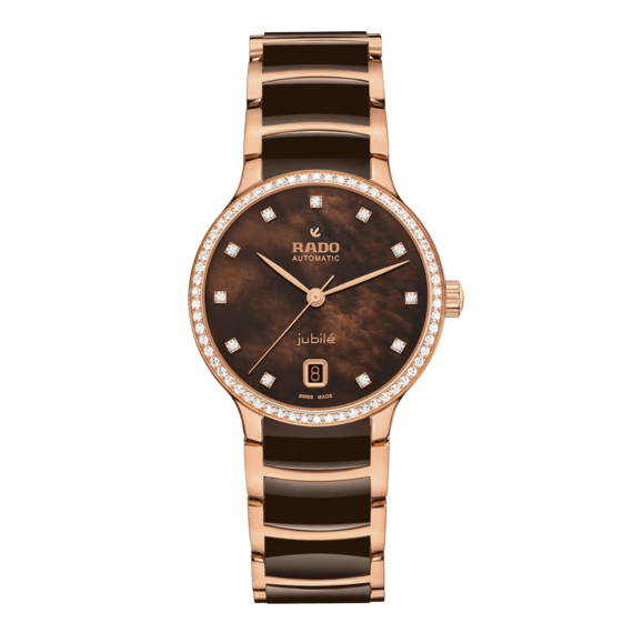 De RADO Centrix Diamonds 35mm R30230922 is een horloge dat op subtiele wijze luxe en technische verfijning verenigt. Met een kastdiameter van 35 mm biedt dit model een perfecte balans: groot genoeg om een statement te maken, klein genoeg om elegant te blijven. De kast is vervaardigd uit stainless steel, afgewerkt met een roségoud‑kleurige PVD‑coating. De bezel is omlijst met 60 Top Wesselton VS‑SI full‑cut diamanten, die samen zorgen voor een schitterend accent zonder te overdrijven. Het glas is gebogen saffierglas aan de voorkant, met antireflecterende coating aan beide zijden, en aan de achterzijde biedt het transparante saffierdeksel zicht op het binnenwerk. Het hart van dit horloge is het automatische R763 calibre, uitgerust met een Nivachron™ balansveer. Het uurwerk is fijn afgesteld in vijf posities en levert een indrukwekkende gangreserve van ca. 80 uur. De wijzerplaat bestaat uit bruin parelmoer (mother‑of‑pearl), aangevuld met 11 diamantindexen. Op 6 uur is er een discreet datumvenster dat de symmetrie bewaart. Kortom, de RADO Centrix Diamonds R30230922 is een luxueus horloge voor wie elegantie zoekt met mechanische verfijning, sprankelende details en betrouwbare prestaties.
