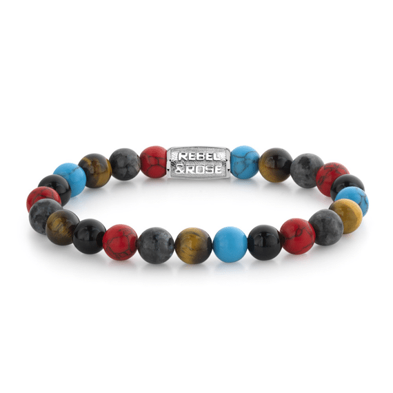 Free spirits, levensgenieters en trendsetters wereldwijd dragen Rebel & Rose. De kralen armbanden met natuurstenen, handgemaakte zilveren sieraden en stoere leren armbanden van Rebel & Rose zien er niet alleen goed uit. Ze zijn ook vervaardigd uit duurzame materialen. Wist je dat de natuurstenen op hoogwaardige Japanse siliconen geregen worden, die een trekkracht van 2,5 kilo aankunnen? Zet een krachtig stijlstatement met deze Rebel & Rose kralen armband RR-80083-S uit de Stones Only collectie. De meerkleurige "Red HotSummer" kralen armband heeft een roestvrijstalen sluiting en Turquoise, Tijgeroog, Larvakiet, Turquoise en Onyx stenen afkomstig van China. Bepaal je eigen stijl met Rebel & Rose. Bij Jan Maes shop je eenvoudig online. De razend populaire Rebel & Rose kwaliteitssieraden worden met zorg bij je thuis geleverd, inclusief bijhorende juwelendoos van het internationale sieradenmerk.