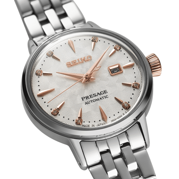 De Seiko Presage SRE009J1 ademt finesse en verfijning met zijn witte wijzerplaat, geïnspireerd door de Clover Club Cocktail. De subtiele structuur en fijngeslepen afwerking van de wijzerplaat zorgen voor een sprankelend effect dat verandert met het licht. Acht diamanten ingelegd op de uurmarkeringen geven een discrete toets van luxe en glamour die elk moment elegant maakt. In het kleine, elegante horloge werkt het automatische kaliber 2R05 met ongeveer 40 uur gangreserve. De kast en band van roestvrij staal geven degelijkheid en duurzaamheid, terwijl het hardlex‑glas en een waterdichtheid tot 5 bar ervoor zorgen dat dit horloge moeiteloos dagelijks gebruikt kan worden, of zorgvuldig gedragen als stijlvolle aanvulling bij een outfit. De SRE009J1 is een perfecte mix van vrouwelijk raffinement, Japanse horlogekunst en subtiele luxe. Bestel eenvoudig online en krijg dit Japans uurwerk met zorg bij je thuis geleverd, inclusief drie jaar garantie op het binnenwerk en de originele Seiko horlogedoos. Jan Maes heeft ook een erkende hersteldienst.