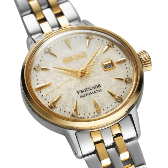 De Seiko Presage SRE010J1, geïnspireerd door de White Lady cocktail, straalt luxe uit met een warme goudkleurige wijzerplaat, bijpassende wijzers en indexen en een elegante metalen band. De fijn afgewerkte wijzerplaat vangt het licht op een sprankelende manier en de acht diamanten op de uurmarkeringen voegen een subtiele glamoureuze toets toe. De kast is compact en vrouwelijk, gemaakt van geborsteld roestvrij staal voor een verfijnde uitstraling. Binnenin werkt het automatische kaliber 2R05 met een gangreserve van ongeveer 40 uur, wat zorgt voor betrouwbare en nauwkeurige tijdmeting bij dagelijks gebruik. De SRE010J1 combineert vrouwelijke elegantie, verfijnde details en Japanse horlogekunst en is ideaal voor wie een horloge zoekt dat tijdloos, chic en praktisch is. Bestel eenvoudig online en krijg dit Japans uurwerk met zorg bij je thuis geleverd, inclusief drie jaar garantie op het binnenwerk en de originele Seiko horlogedoos. Jan Maes heeft ook een erkende hersteldienst.